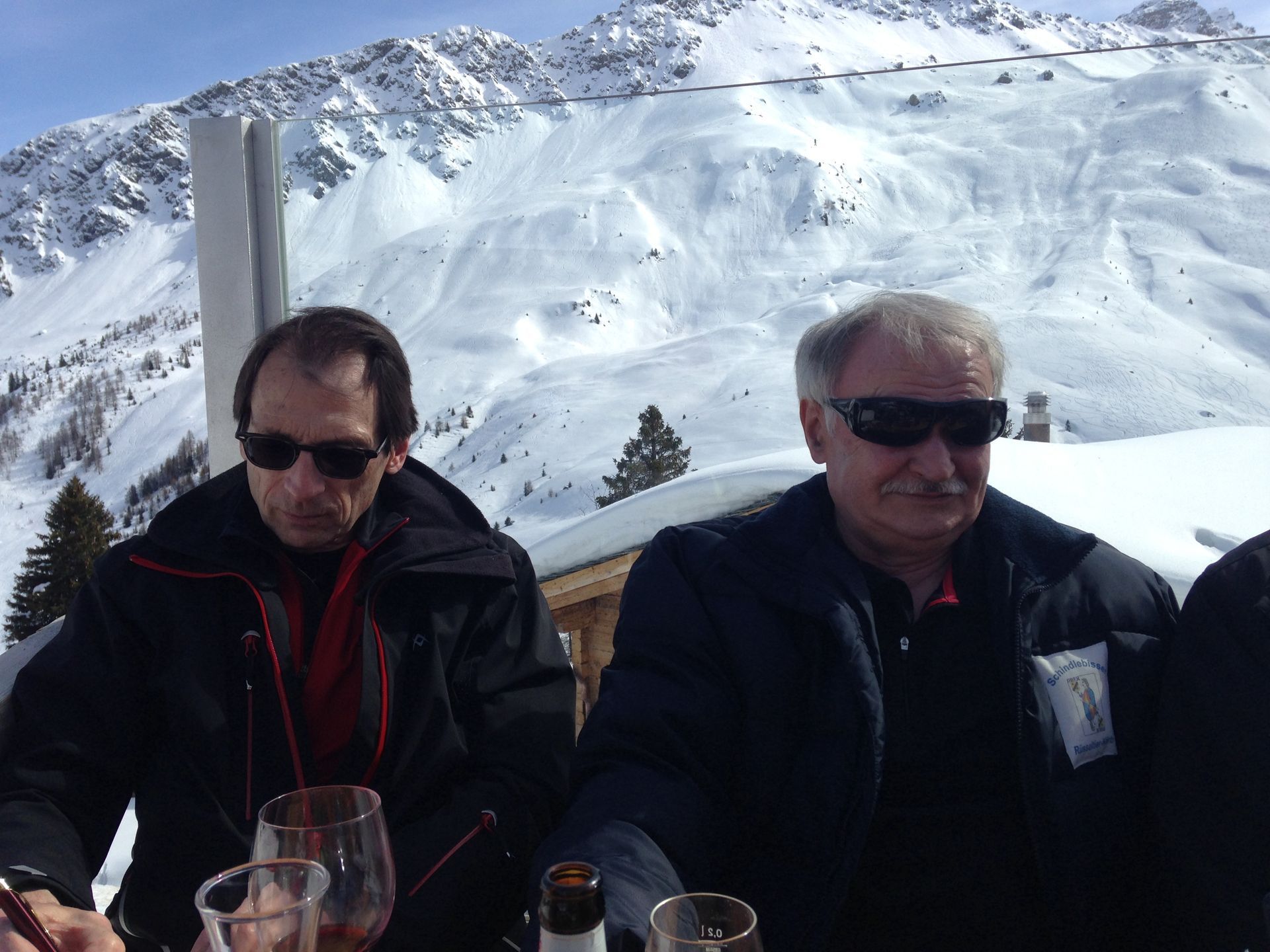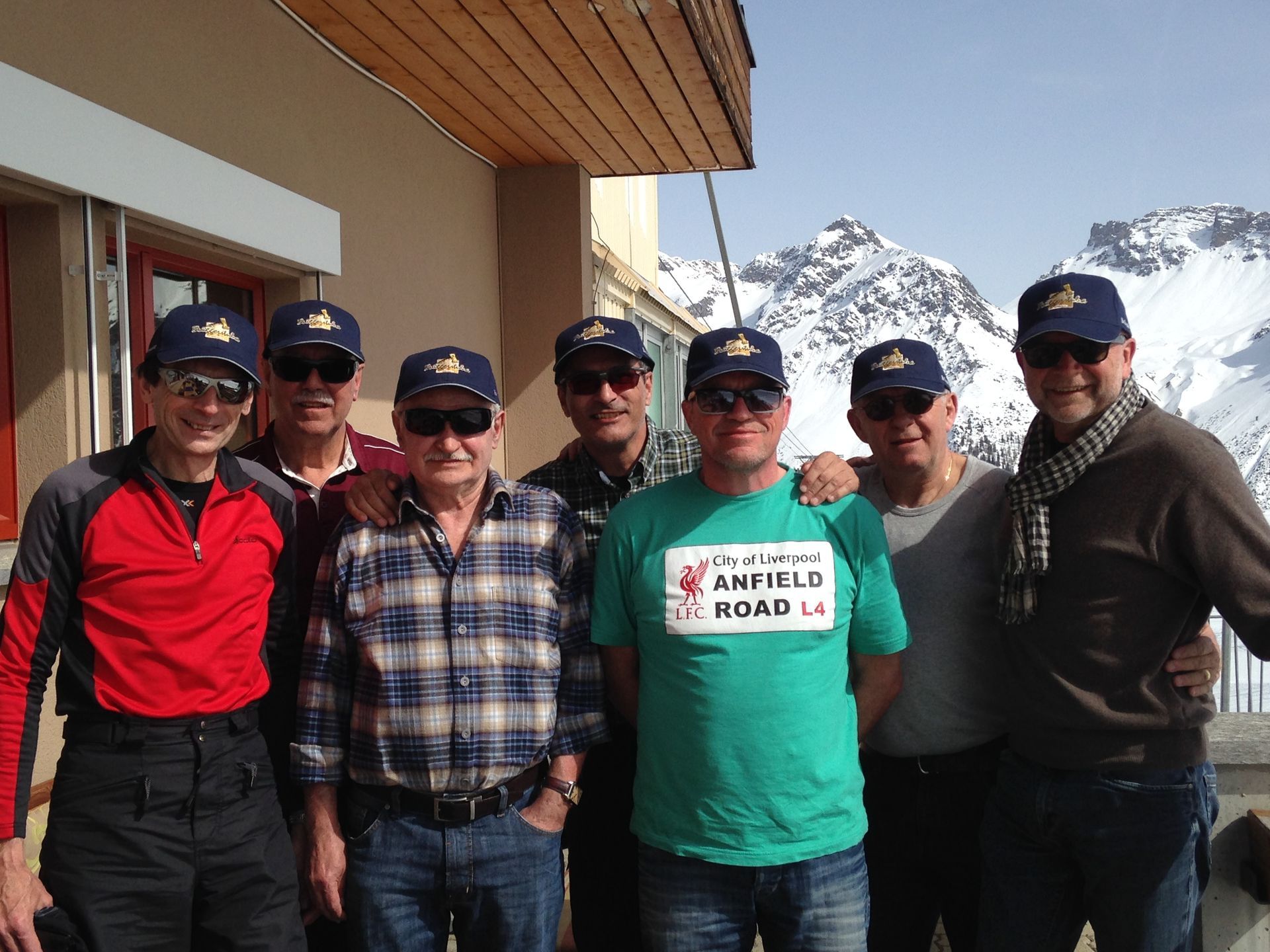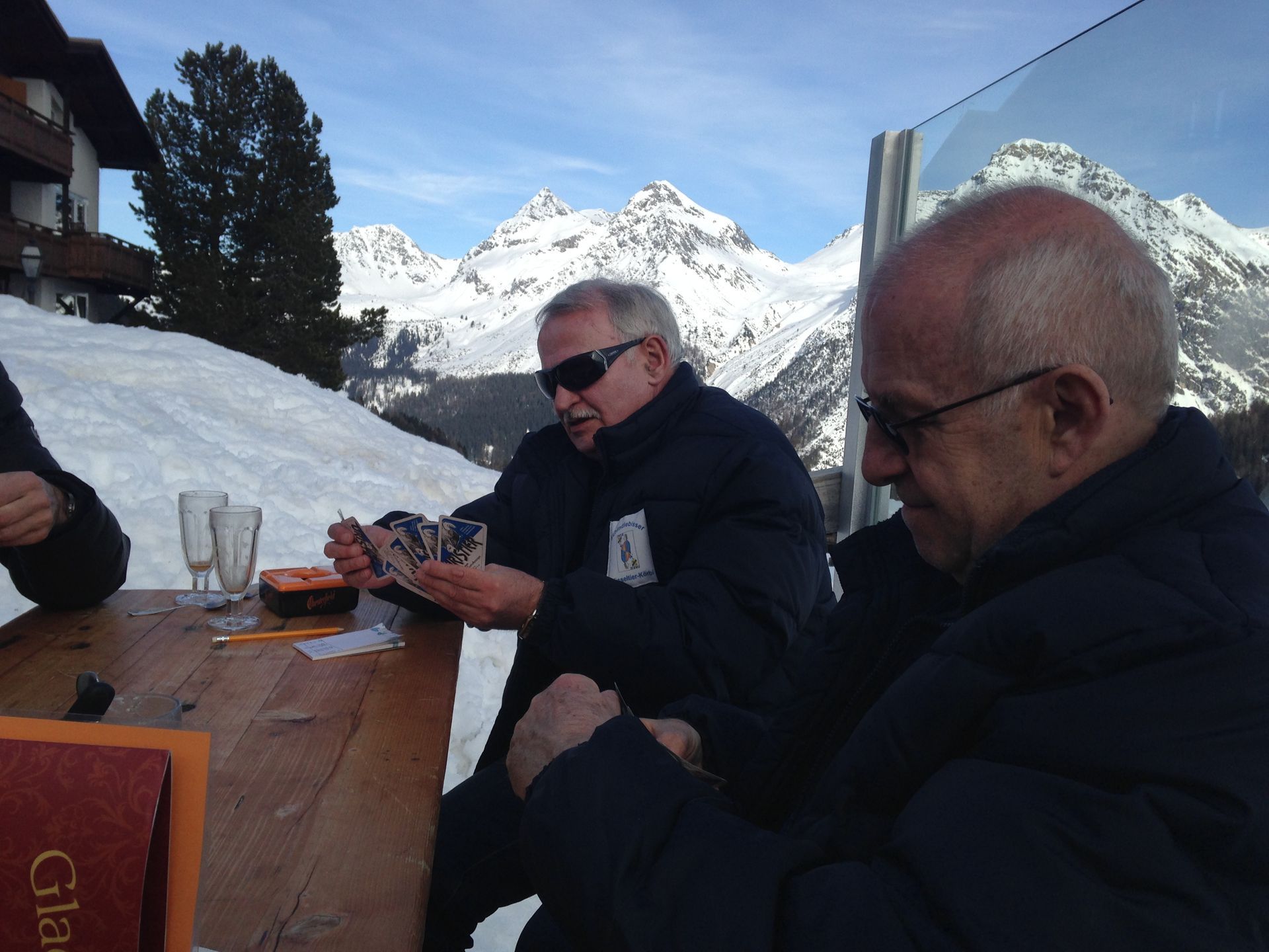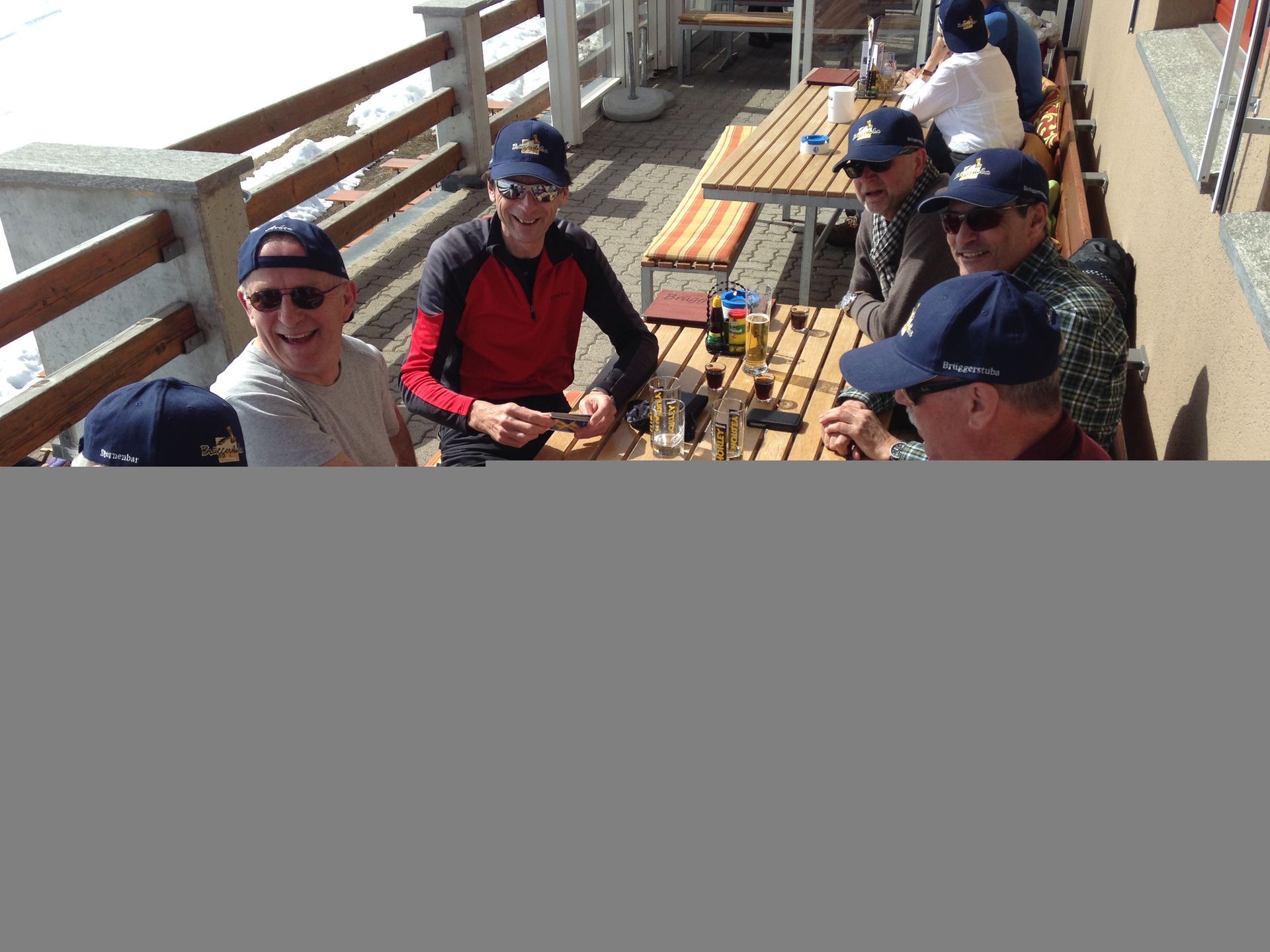 Von einem Abreisemontag keine Spur, „Speedy“ Hsws dank Sherpa Präsi um 9.00 Uhr auf der Piste, Luci wollte noch sein Retour- Billet vom Vortag einlösen, was misslang und so traf man sich zum gemütlichen Mittagessen auf der Terrasse der „Brüggerstuba“. Ein Privat-Setting von Hsws bei unserem Büsiater, vom Prostata-App von Dr. Vogel über die Grundfosspumpe zur Röteli Runde so näherte man sich dem Höhepunkt. Dazwischen der Serviettentrick von Stökker welcher jedem eine schöne Kappe bescherte und dann die Ueberredungskünste für die vierfach Schlussrunde beim 6 er Schälle….das war dann „Top of Arosa“ und die grosse Frage an Präsi „Vladi“ wie viel gibt 4x 33????