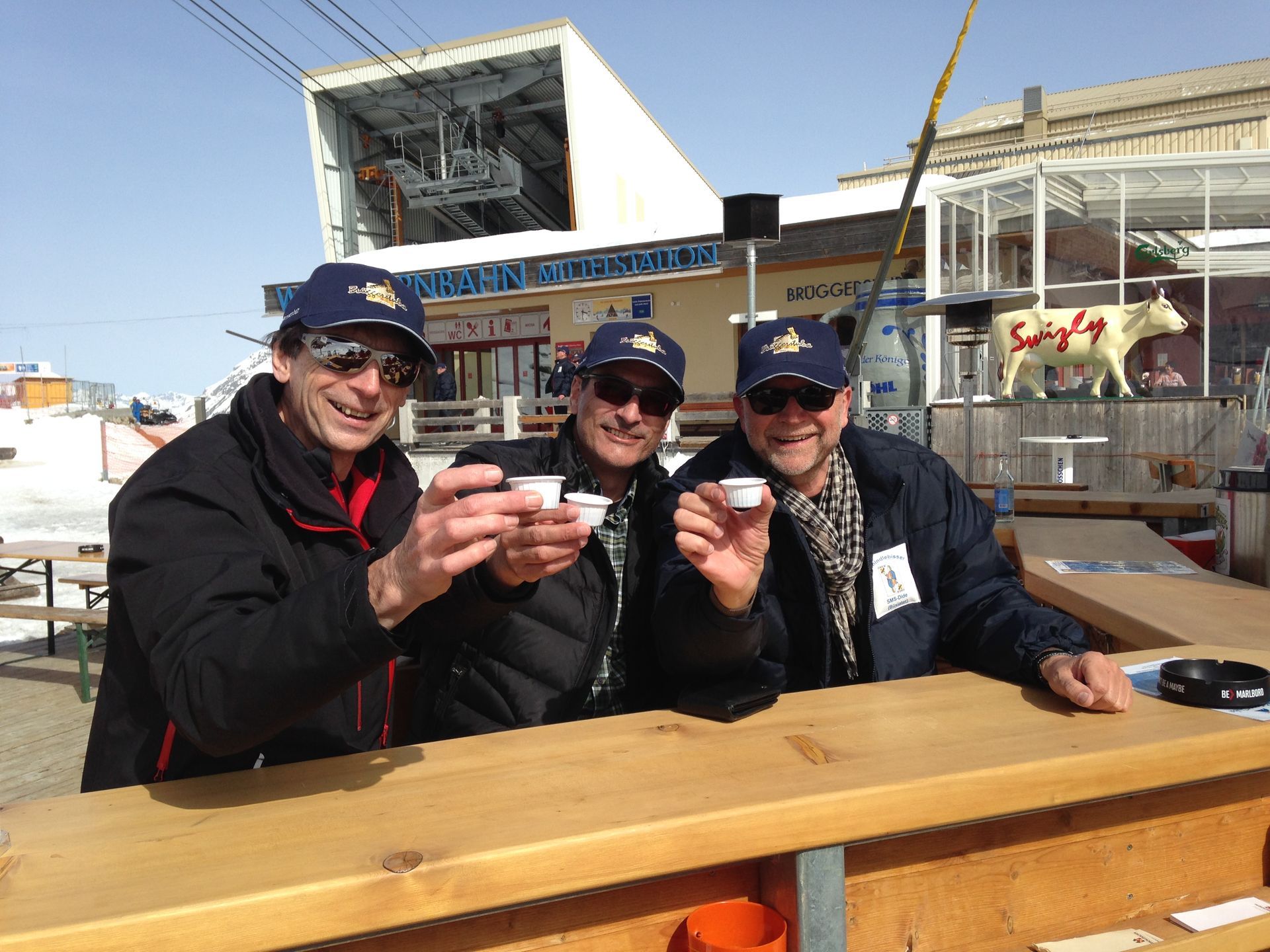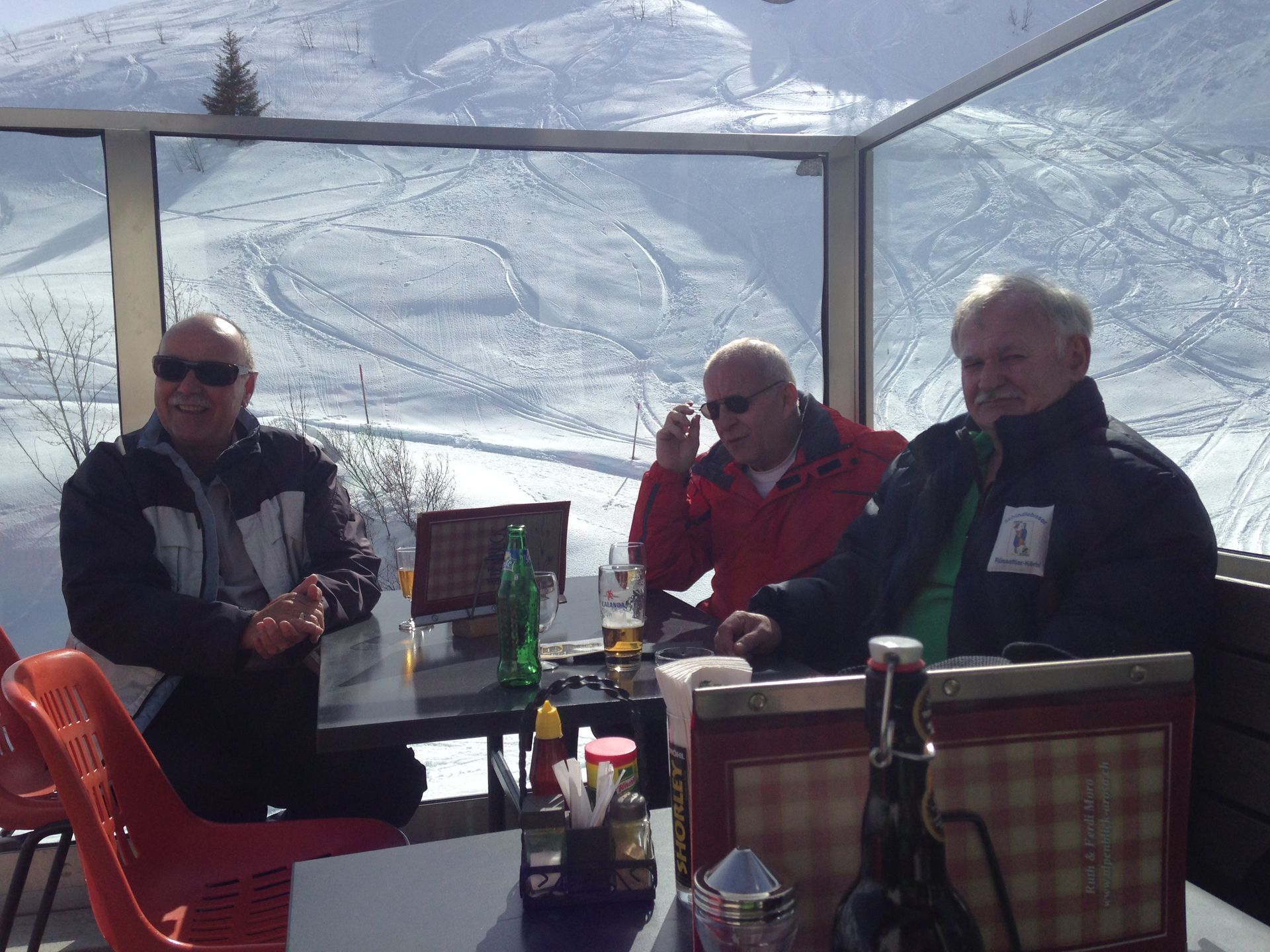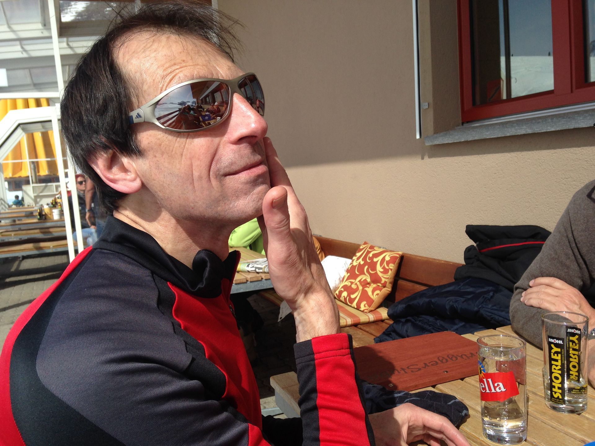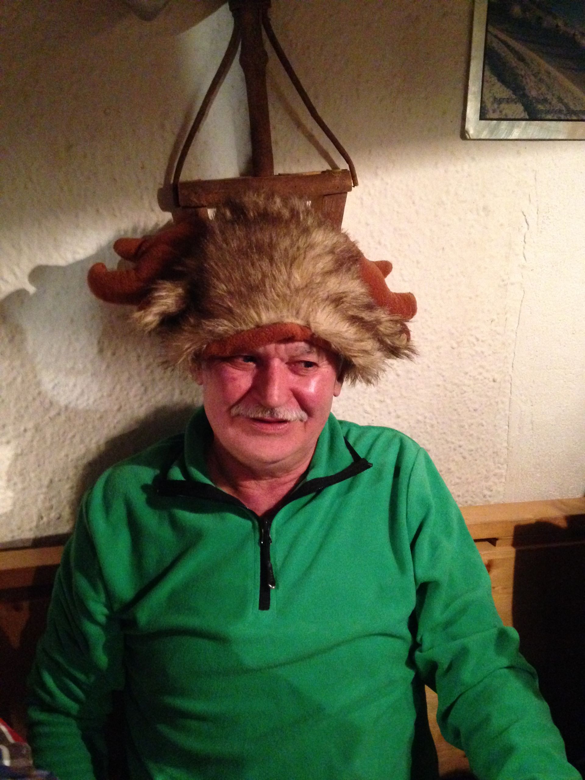 Von einem Abreisemontag keine Spur, „Speedy“ Hsws dank Sherpa Präsi um 9.00 Uhr auf der Piste, Luci wollte noch sein Retour- Billet vom Vortag einlösen, was misslang und so traf man sich zum gemütlichen Mittagessen auf der Terrasse der „Brüggerstuba“. Ein Privat-Setting von Hsws bei unserem Büsiater, vom Prostata-App von Dr. Vogel über die Grundfosspumpe zur Röteli Runde so näherte man sich dem Höhepunkt. Dazwischen der Serviettentrick von Stökker welcher jedem eine schöne Kappe bescherte und dann die Ueberredungskünste für die vierfach Schlussrunde beim 6 er Schälle….das war dann „Top of Arosa“ und die grosse Frage an Präsi „Vladi“ wie viel gibt 4x 33????