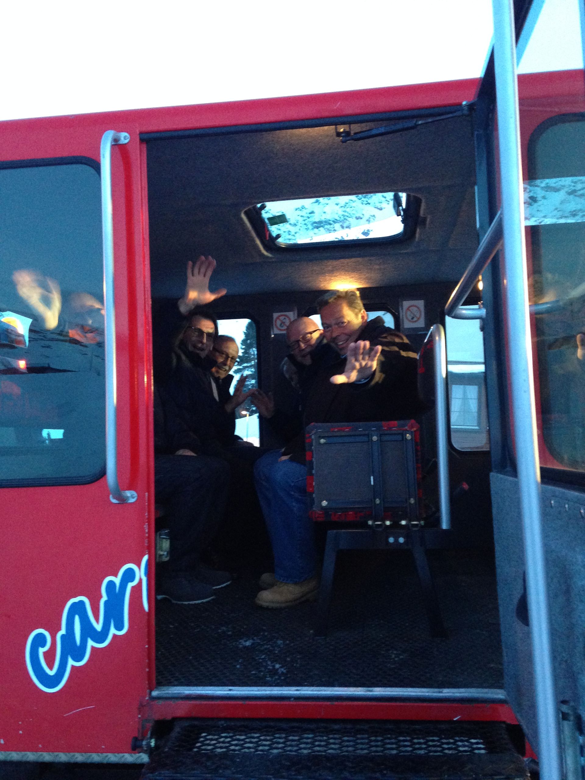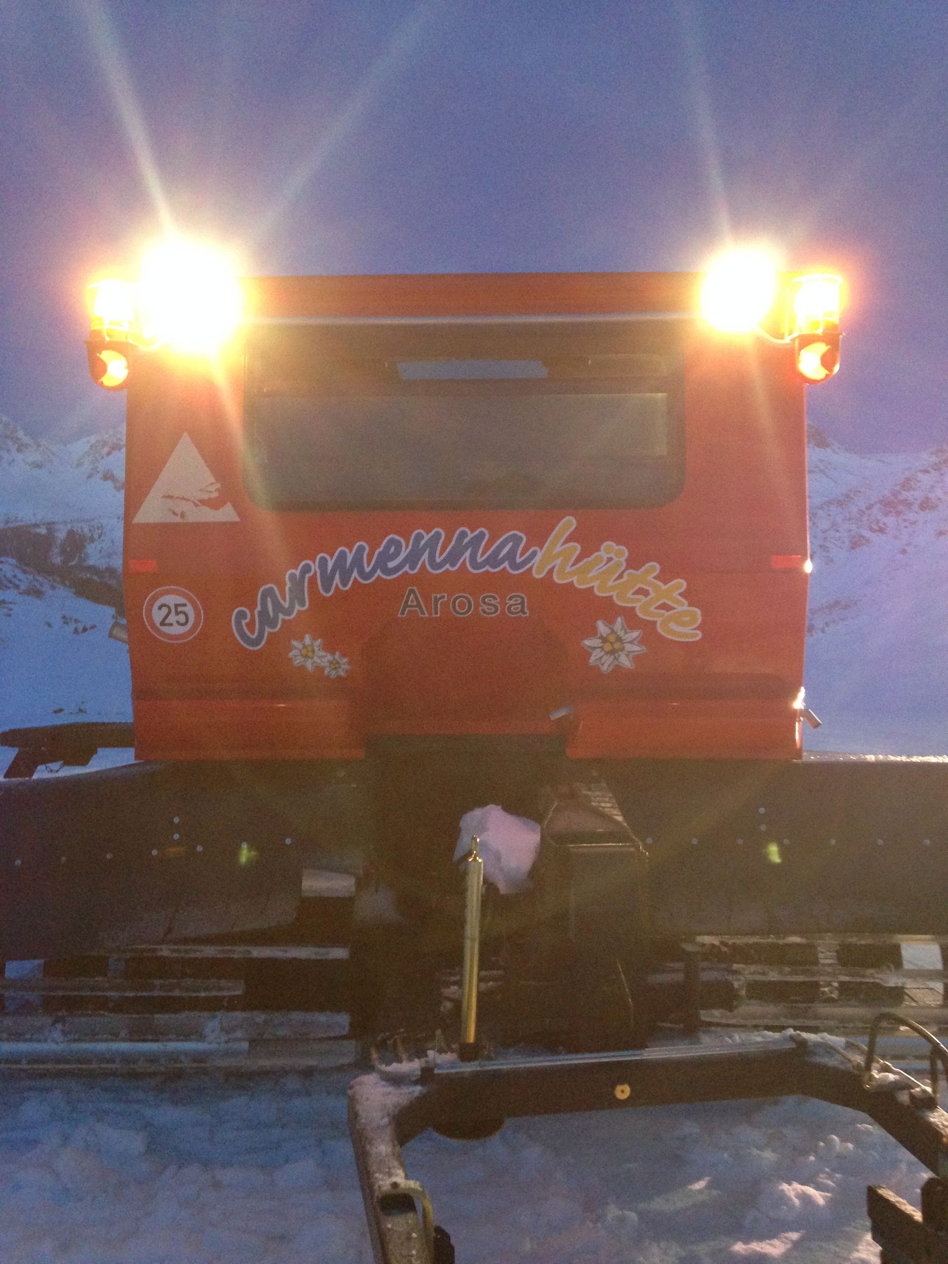 Der Brüggliapéro war Pflicht, zum Nachtessen gings mit dem Ratrac in die Carmennahütte, dank unseren beiden „glatzköpfigen Räbeliechtli“ konnte der Ratrac sein Licht ausschalten. Co-Pilot Luci hatte seinen Happy-Day, unbestätigt ist, dass er noch in der Nacht Geräusche (brmm, brmm,brmm ) von sich gegeben habe. Dank strategisch guter Platzierung (alle sonst noch anwesenden Frauen mussten an unserem Tisch vorbei aufs WC) waren wir plötzlich 10 Fondueesser/innen was zur Gleichung führte: „2 Schnäggli = Hörnli“!