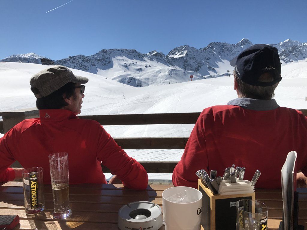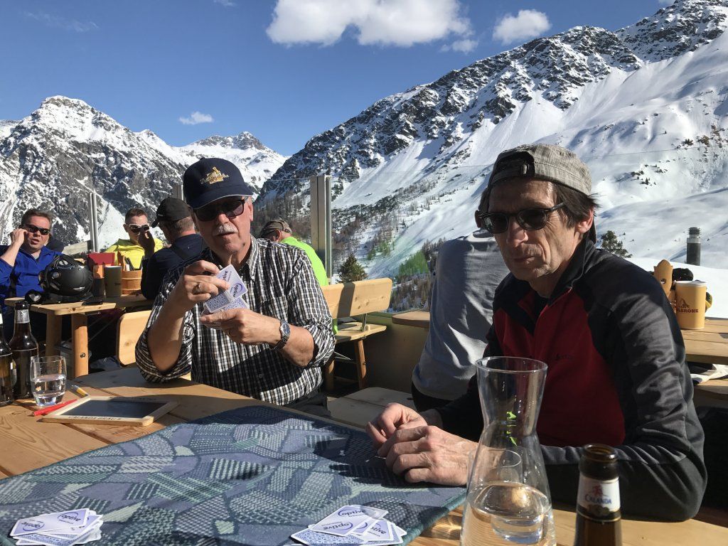 Das Auto mit Hansueli, Hsws und Prix Garantie war gut unterwegs, sie erreichten Arosa um 10.00 und gingen sogleich auf die Piste. Schon gegen Mittag musste dann leider festgestellt werden, dass das tolle Wetter die Pisten nicht besser macht. Via Apéro in der Carmenna Hütte erreichten die drei dann das Gspan wo man sich zum Mittagessen traf, auch die beiden Kaffeetanten Luci und Stökker kamen dazu. Es sollte ein lustiger Nachmittag werden, Hansueli wurde vom Glarnertisch adoptiert (da die Dokumente in Ordnung waren), das ältere Ehepaar am Nachbartisch war amüsiert, unser Oberschlumpf wusste nicht wohin er gehört und unser Frauenarzt „Dide“ war auf der Suche nach Arbeit. Gejasst wurde auch noch, das Brüggli war out und Hansueli beendete sein „Fremdgehen“ mit einem veritablen Sturz, der leider weder fotografiert noch gefilmt wurde.
